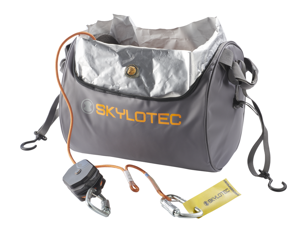 The DEUS ONE is a personal, fully automatic self-evacuation device. The very small, handy format offers intuitive operation in emergency situations and is ready-to-use due to its configuration with rope and steel carabiners. Without any necessary additional intervention in the abseiling process, even injured or unconscious persons arrive safely on the ground. The extremely compact and lightweight hybrid rope is only 5.9mm thick and heat-resistant up to 450°C. The set is maximally protected from moisture in a Sealpac packaging and can thus achieve a 15-year service life. All components are packed very practically in a compact, protective bag with adjustable straps, making it easy to take to any workplace.