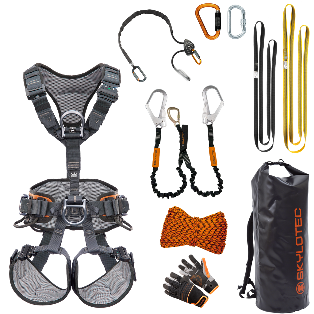 This belay set consists of the GRYPHON Harness, which is a rope work harness with a breathable mesh waist belt, ergonomic shoulder straps and quick-release leg loops for comfort and ease of use. It has sternal, lateral and dorsal attachment points, certified to EN 358 and EN 361, with a maximum load capacity of 140 kg. The LORY X SET is used for workplace positioning and the SKYSAFE PRO FLEX Y is the appropriate lanyard that connects the user to the rope. The X-TREM DYNAMIK 11.0 in a length of 60 metres is a dynamic rope that impresses with its robustness and abrasion resistance. 17 LOOP 26 kN webbing slings (15 x 80cm / 2 x 150cm), 17 OVALSTEEL-SC carabiners and a passO-Tri carabiner are included in the scope of delivery and are used to attach the rope. Two pairs of SKYGRIP FullFinger gloves round off the set and protect the wearer's fingers. A DRYBAG is included with the set so that everything can be stowed away safely. This SET is compiled in accordance with DIN14800-17:2015.