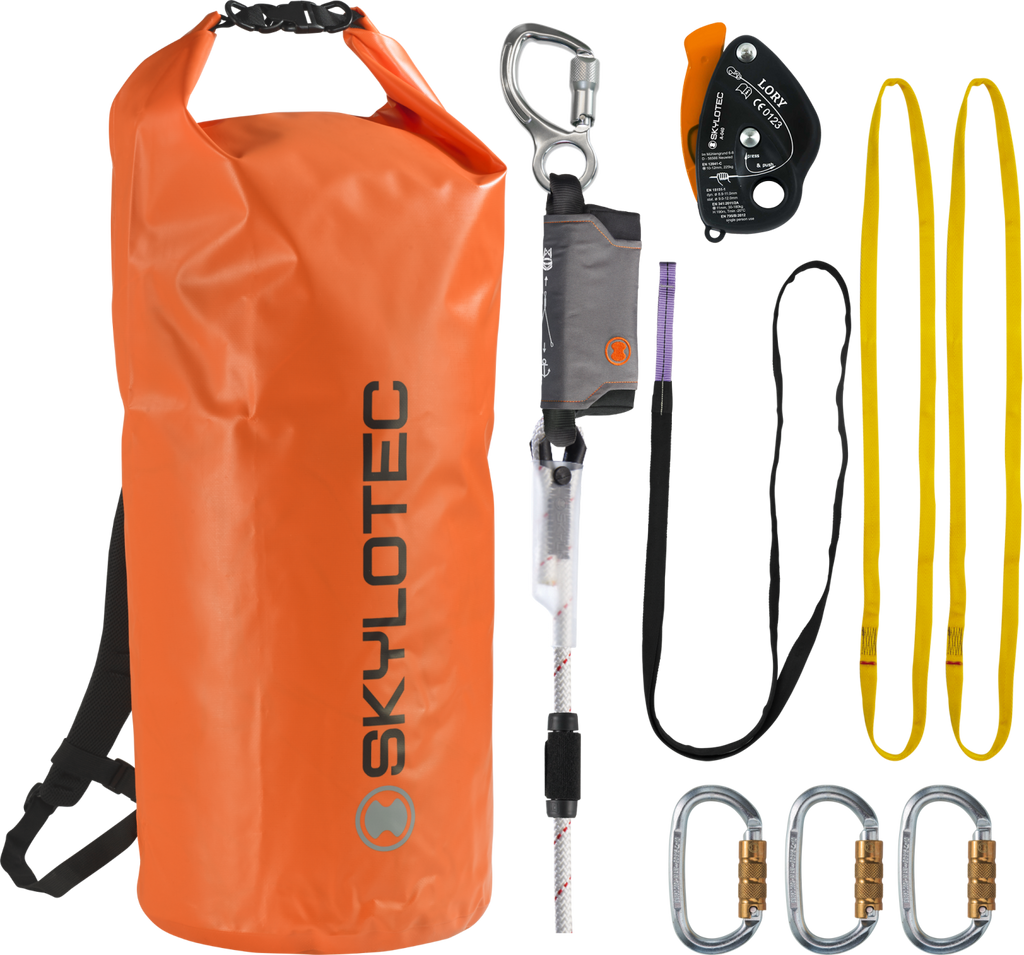 The new INDUSTRIAL LEAD CLIMBING SET is the perfect partner for a safe ascent or descent on a pylon. The SET is used for lead belaying and consists of a LORY semi-automatic belay device, an 11mm SUPER STATIC rope with sewn-in tape fall arrester for 140kg as well as two carabiners and two LOOPs. It comes in a practical DRYBAG and can thus be easily transported to the place of use. While one person belays on the ground, the other can step forward and do their job. In case of a fall, lowering the injured person via the LORY and the partner on the ground is quick and easy. The distances between the vertical belay points can be up to 1.4 meters. The possibility of locking the CAM allows the rope to be pulled through the LORY without noticeable resistance during lead climbing.