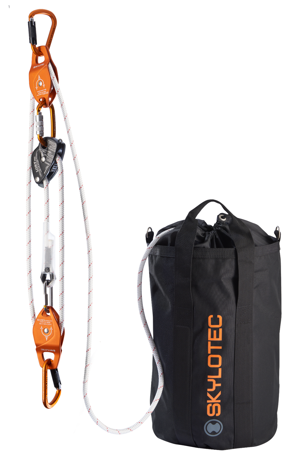 The PULLEY KIT 3:1 is a self-contained, pre-rigged hauling system with controlled descent capability including an auto-lock (progress capture) function during lifting, and an easily operated lowering mechanism with secondary lock (also called Over Lock or Panic Lock function). It can be used for rescue within industries where confined spaces and restricted areas are present and for advanced or special rescue situations. It works as a single line system in an unplanned rescue situation or as part of a twin line rescue system.